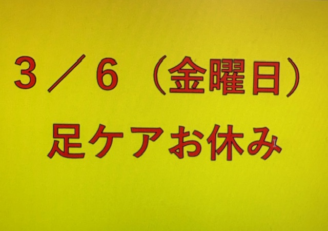 ![]() | 3/6金曜日 足ケアはお休みです |